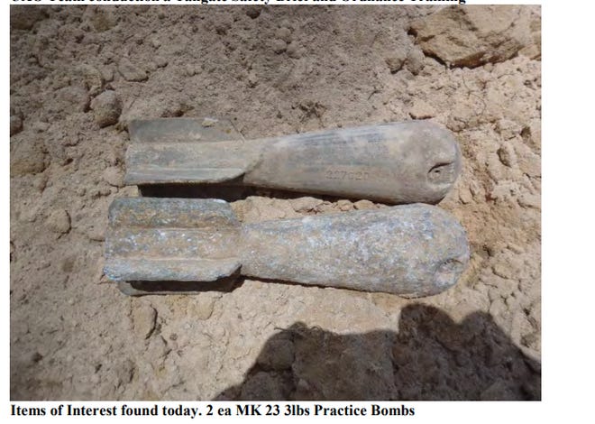 Unexploded munitions may be found rusted and buried partially in sand or behind foliage, according to a military outreach film from 2022. There is a disclaimer in the video that “it may not always look like ammo.”